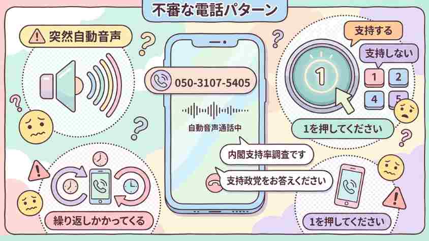 050-3107-5405は、「内閣支持率」「政党支持」を名乗る自動音声アンケート電話として多くの報告があります。